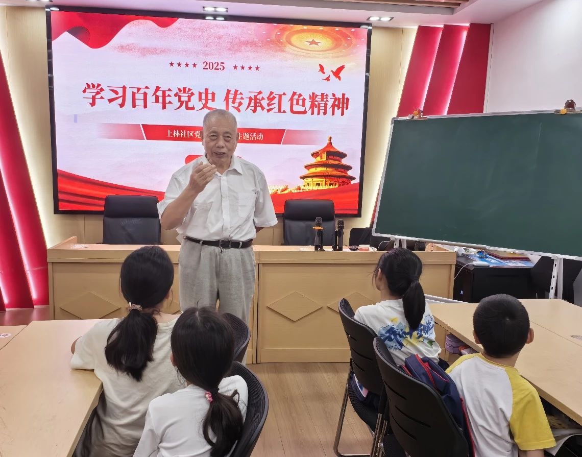 上林社区“闪闪红星”暑假爱心托管班中,老党员老干部石新应以朴实语言结合亲身经历,从党的百年奋斗历程中选取青少年易懂的红色故事,展现革命先辈的理想信念与奉献精神。讲述间,他时而回忆艰苦斗争岁月,时而畅谈国家发展成就,孩子们聚精会神,不时举手提问,互动热烈。