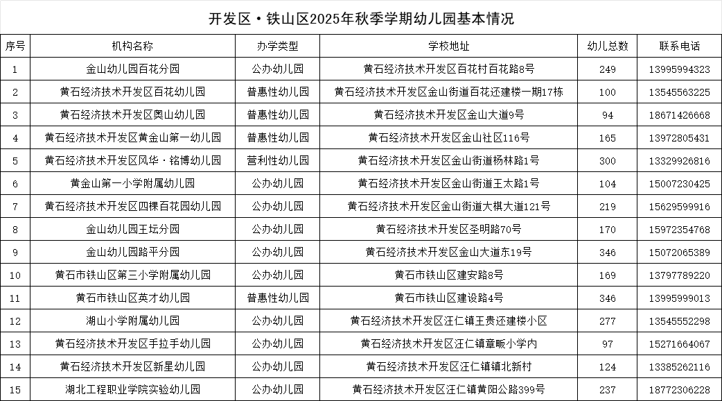 开发区·铁山区2025年秋季学期幼儿园基本情况