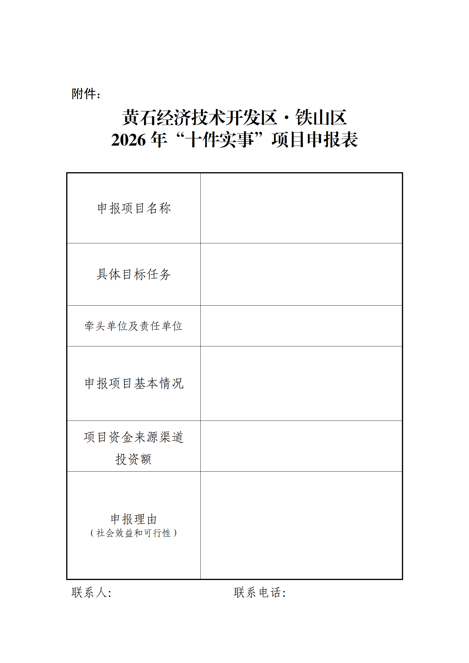按照《黄石经济技术开发区·铁山区2026年“十件实事”项目申报表》要求规范填报。以书面、信函、电子邮件等形式向开铁区党政办(督查室)提出意见和建议。区党工委、区委管委会、区政府将对征集到的意见建议进行认真梳理和研究,择优纳入2026年民生实事项目候选清单,努力把群众期盼转化为实实在在的民生成果