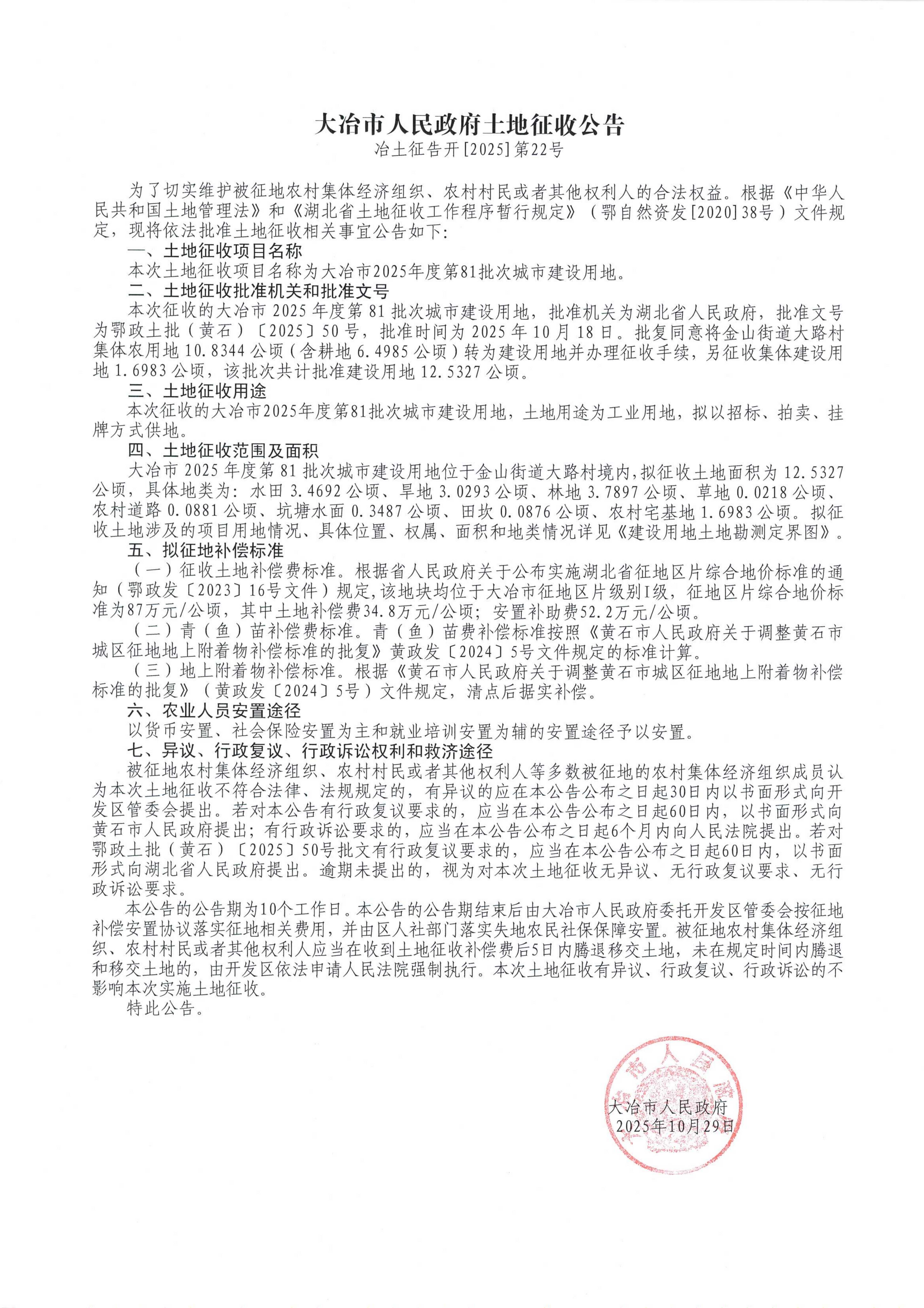 大冶市人民政府土地征收公告——冶土征告开[2025]第22号