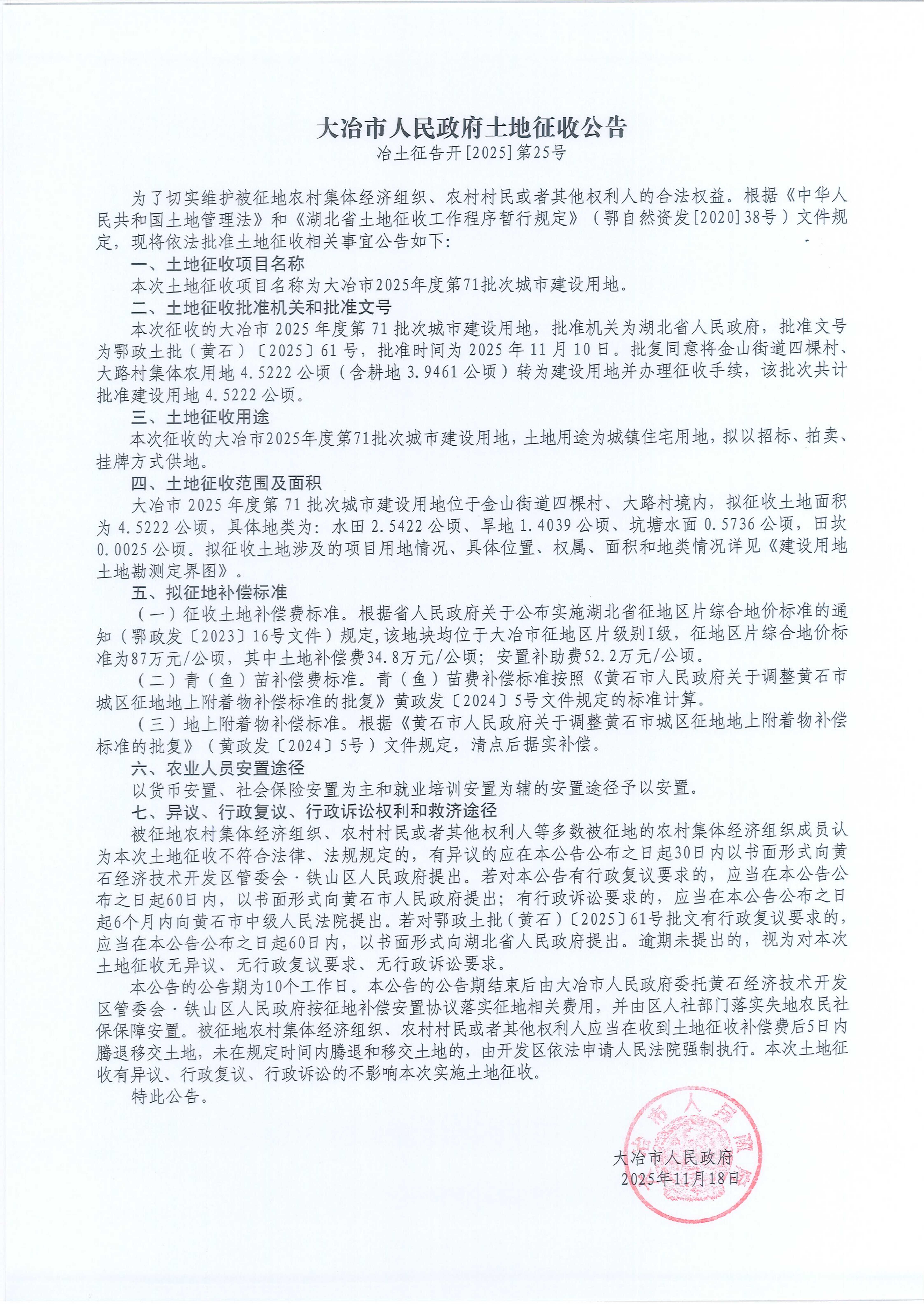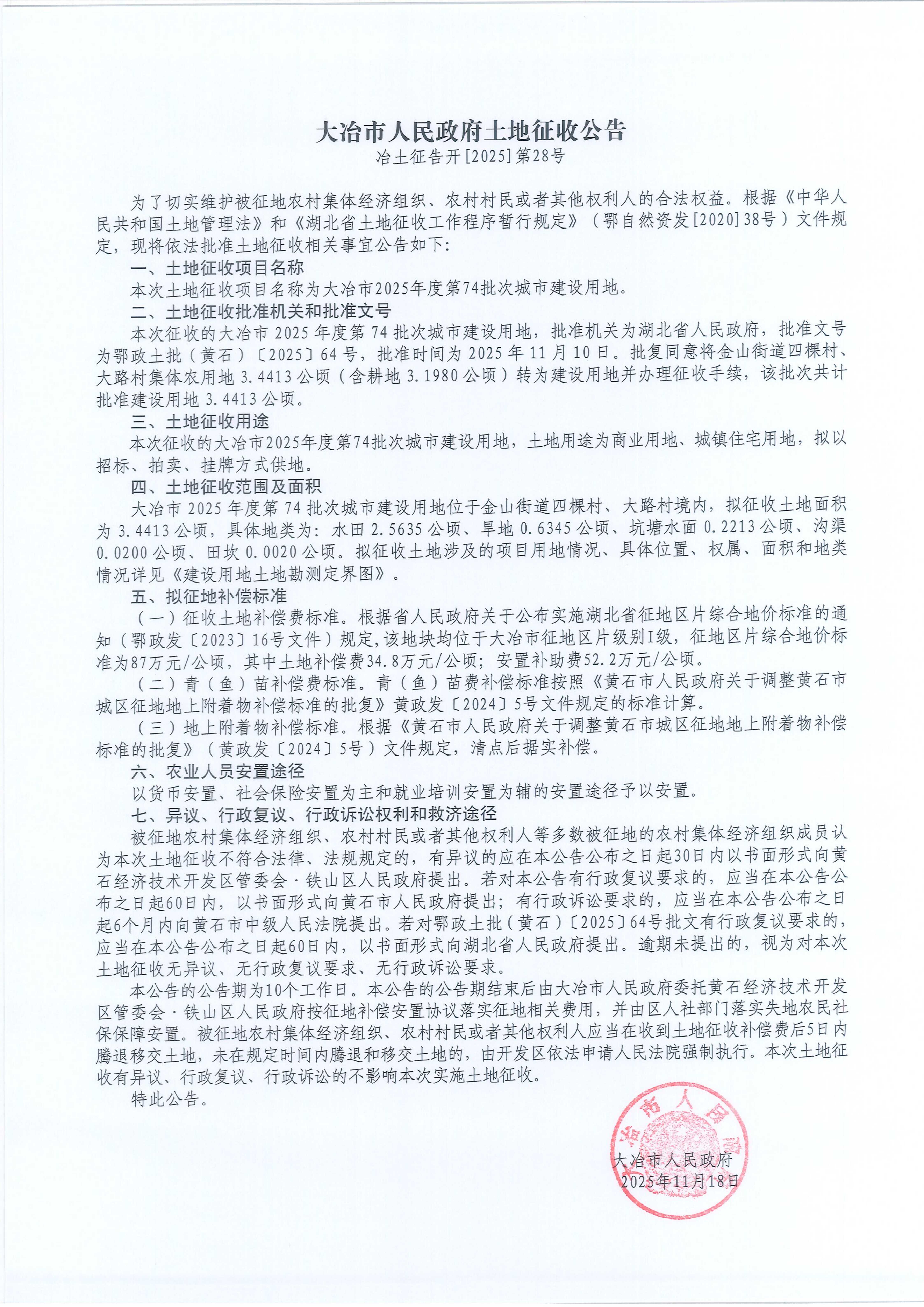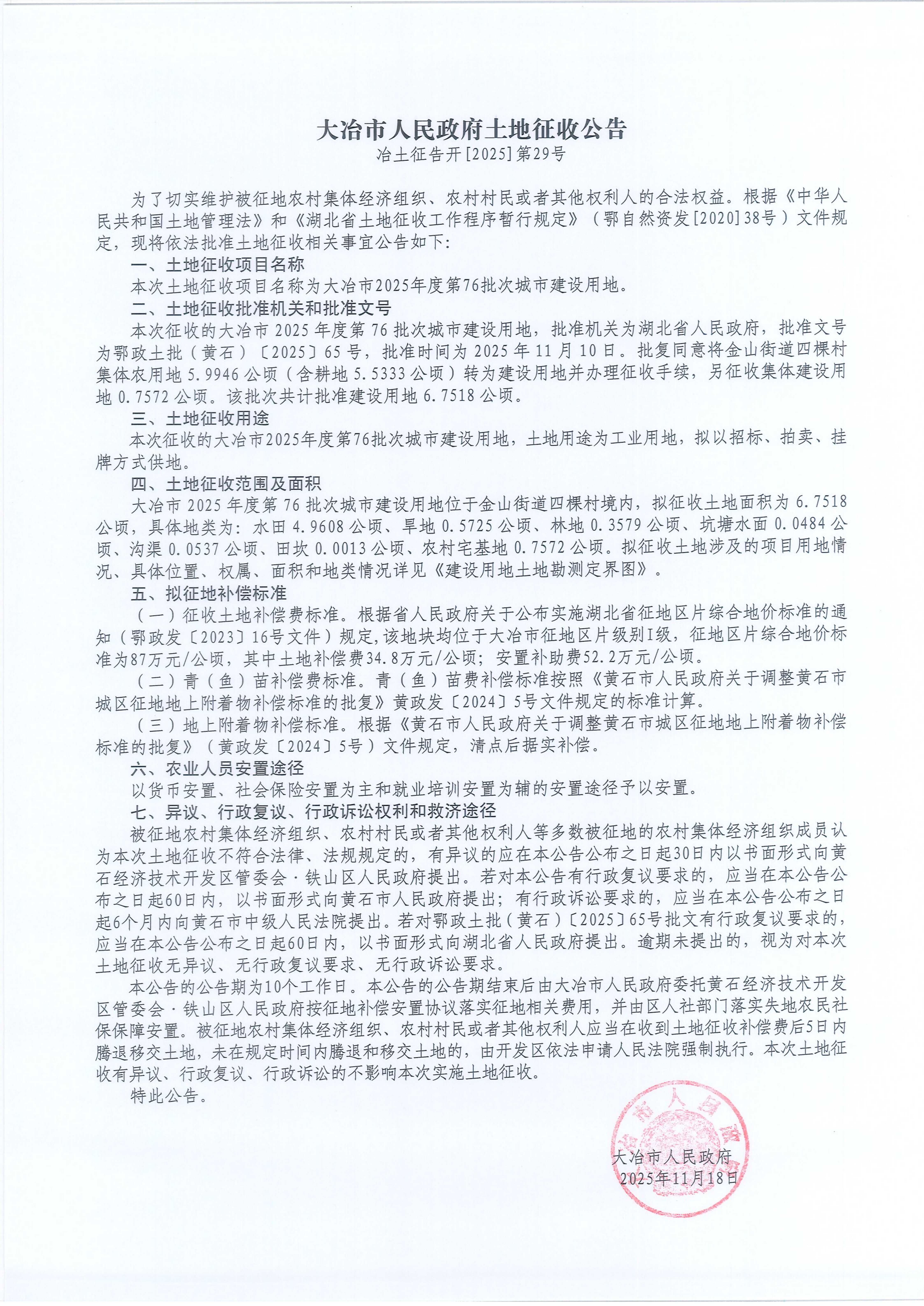 大冶市人民政府土地征收公告——冶土征告开[2025]第25、27、28、29、30、31号