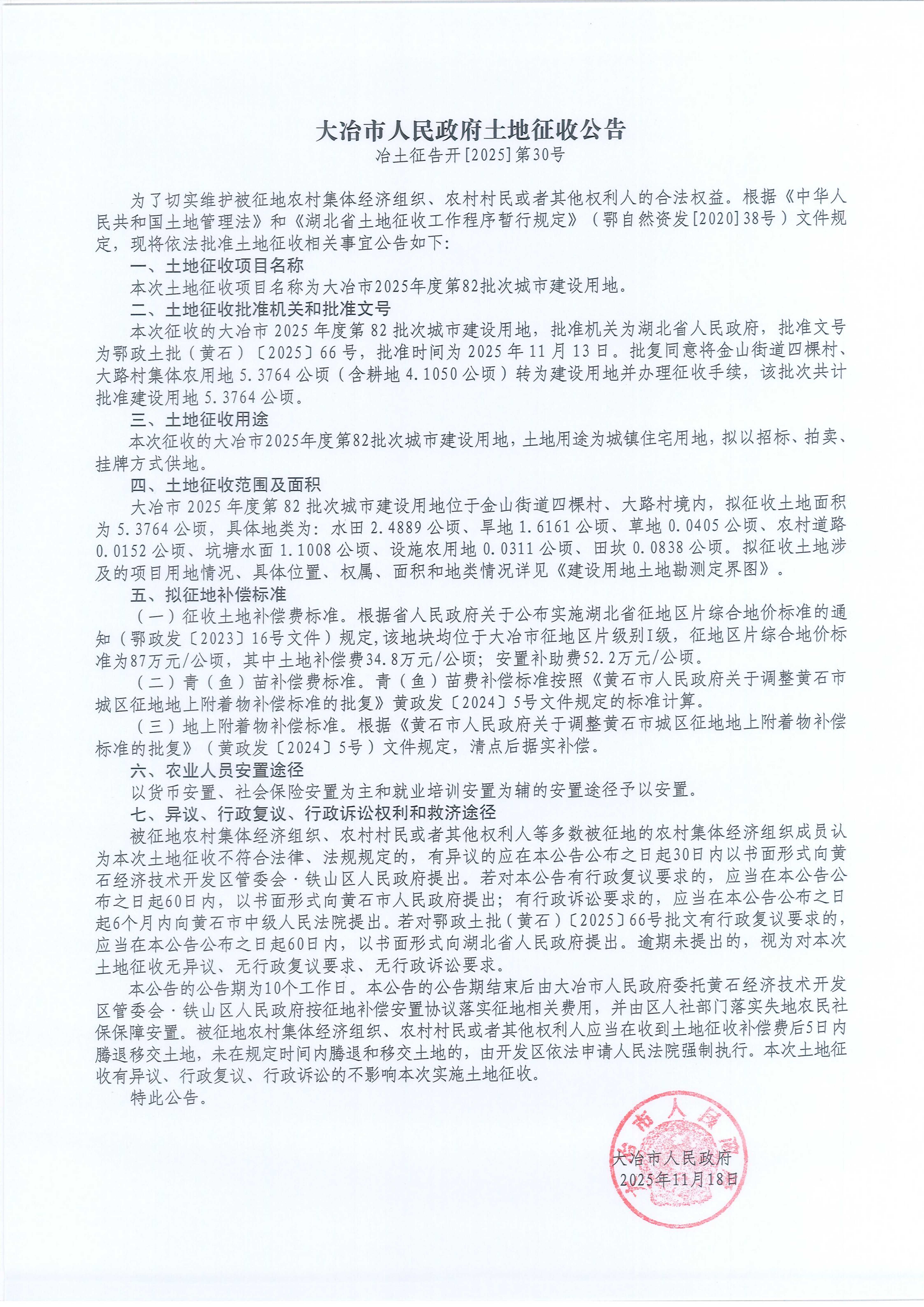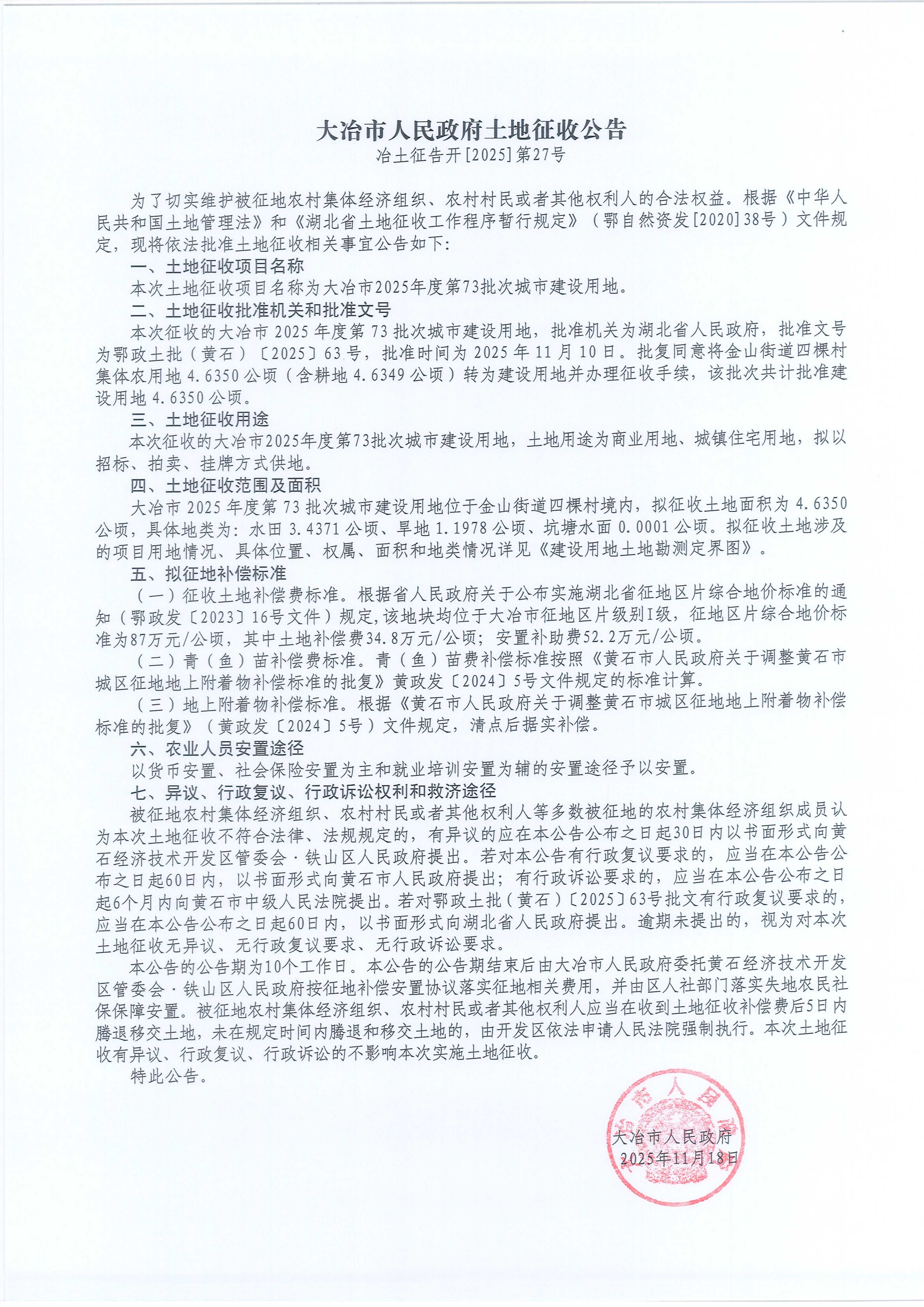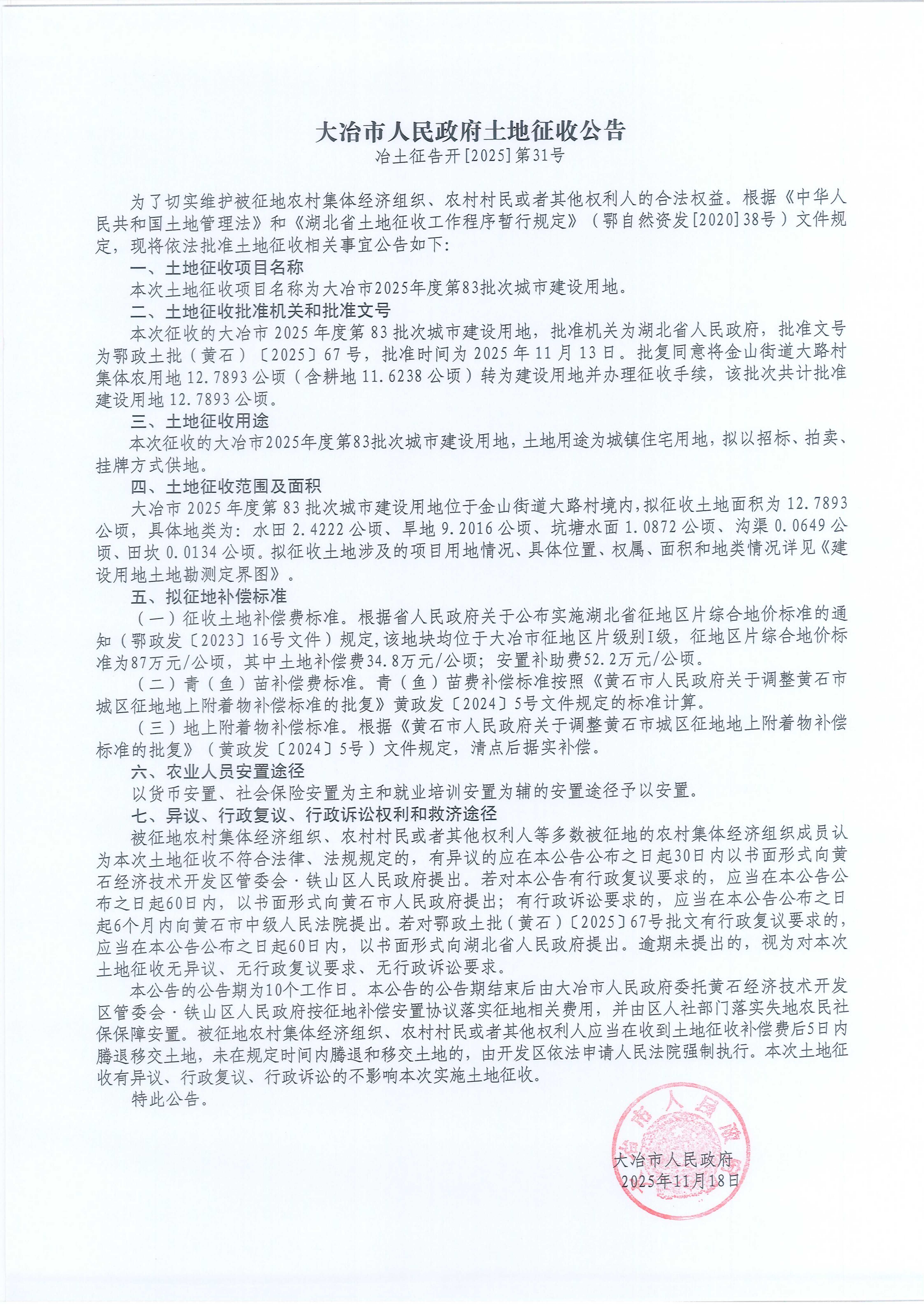 大冶市人民政府土地征收公告——冶土征告开[2025]第25、27、28、29、30、31号