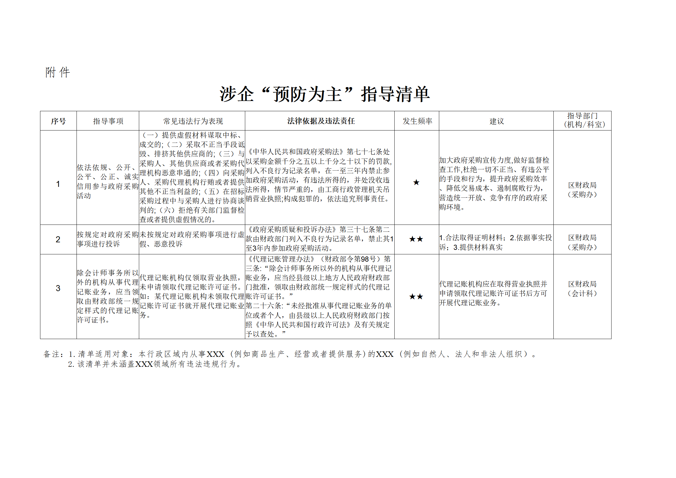 为规范财政行政执法工作,持续优化法治化营商环境,按照《开发区·铁山区关于落实“预防为主、注重服务”涉企行政执法模式的实施方案》要求,现将我局《涉企“预防为主”指导清单》印发给你们,请遵照执行。