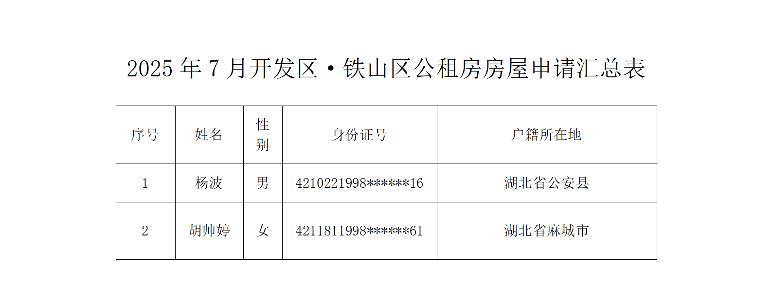 湖北全好科技有限公司申请东楚金山苑公租房D-8-202号,用于安置本单位1名员工;胡帅婷申请东楚金山苑公租房A-1-315号。根据《黄石市2025年住房保障方案》,公租房申请人(使用人)应符合“在我市城区内无自有住房”,现将湖北全好科技有限公司杨波等1名员工及胡帅婷相关信息予以公示,请广大市民进行监督,如认为申请人杨波、胡帅婷在我市城区有住房,请在公示期间内及时向我局反映。