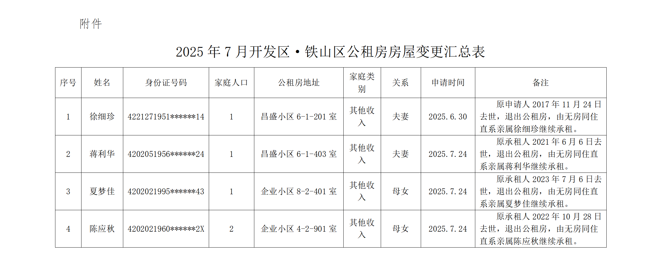 昌盛小区6-1-201室原承租户于2017年11月24日去世,退出公租房,经公租房承租户同住直系亲属徐细珍申请,继续承租该房屋;昌盛小区6-1-403室原承租户于2021年6月6日去世,退出公租房,经公租房承租户同住直系亲属蒋利华申请,继续承租该房屋;企业小区18-2-401室原承租户于2023年7月6日去世,退出公租房,经公租房承租户同住直系亲属夏梦佳申请,继续承租该房屋;企业小区4-2-901室原承租户于2022年10月28日去世,退出公租房,经公租房承租户同住直系亲属陈应秋申请,继续承租该房屋。现将以上四名申请人相关信息予以公示,具体内容如下: