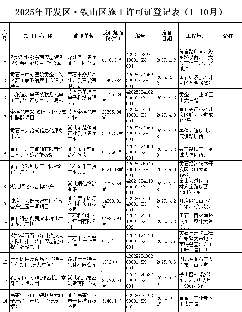 2025年开发区·铁山区施工许可证登记表(1-10月)